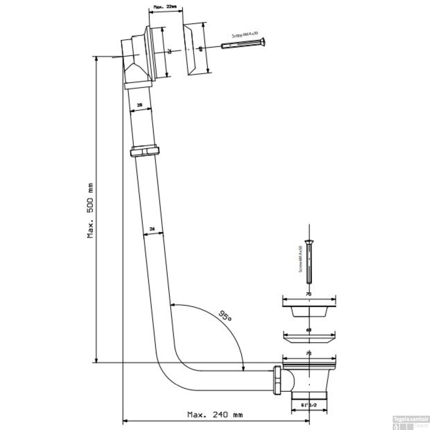 Deze badafvoer van het merk Sapho is inclusief sifon en wordt geleverd in een messing gouden kleur. De diameter van de waste is 52 mm, en de afvoer heeft een aansluiting van 1/2″ (zie ook technische tekening).
