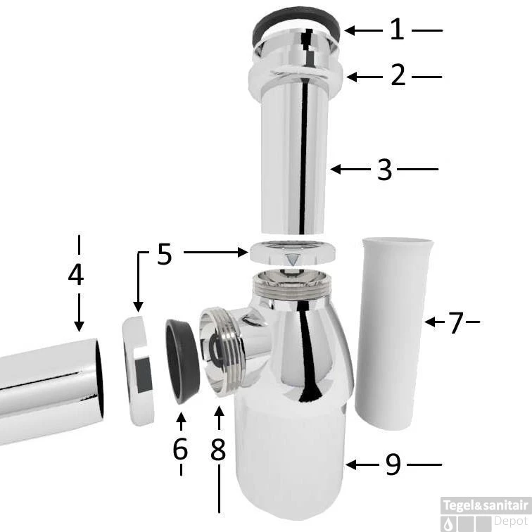 - 7. Verticaal buisje die het waterslot in de beker maakt, dit is tevens een afdichtring.