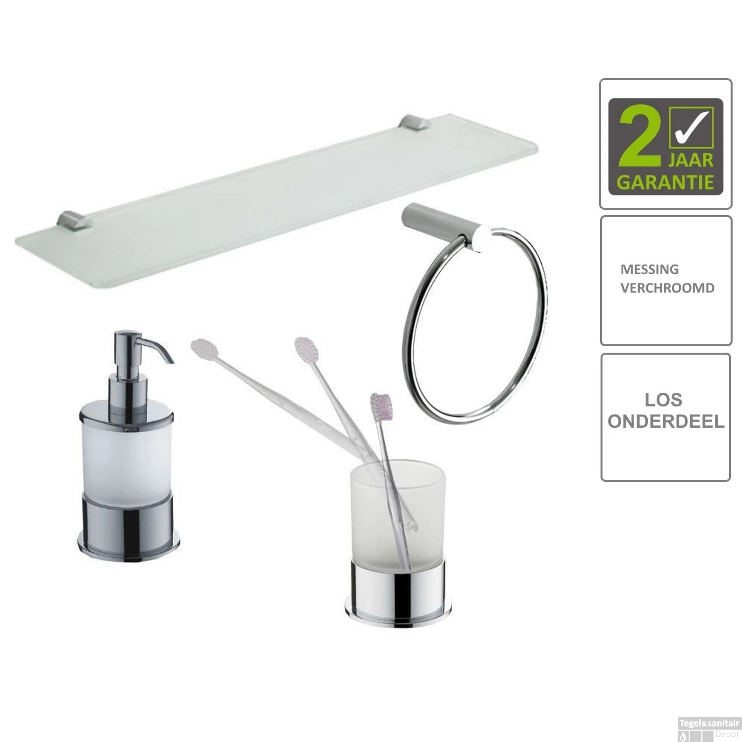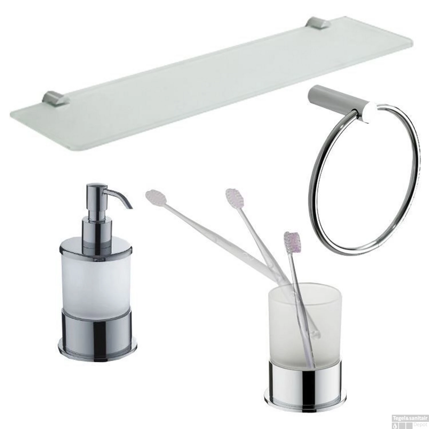 - – Handdoekring, zeepdispenser, tandenborstelhouder, glazen planchet