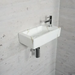 Fonteintjes zijn een belangrijk element in uw toiletruimte: de ruimte is vaak beperkt en het formaat van deze fontein biedt daarom uitkomst. Met een breedte van 36,5 cm, een diepte van 18 cm en een hoogte van 9 cm past deze fontein van het merk Wiesbaden perfect in iedere toiletruimte. Het fonteinbakje is gemaakt van keramiek maar door de unieke ader vorming die er in is gekleurd lijkt het net op Marmer. De marmerlook wat een zeer luxe uitstraling aan uw toiletruimte geeft, met de kenmerken en het gebruiksgemak van keramiek.