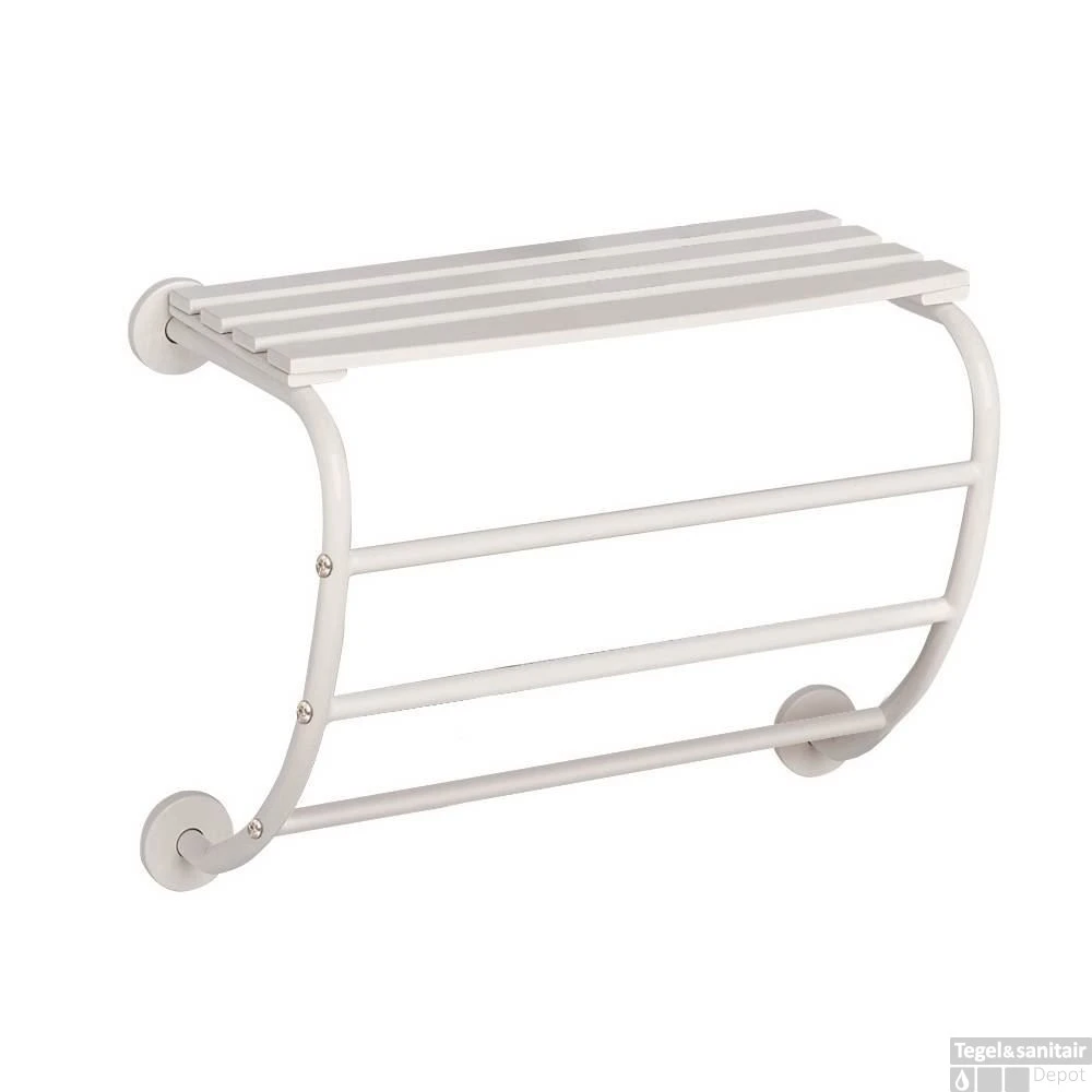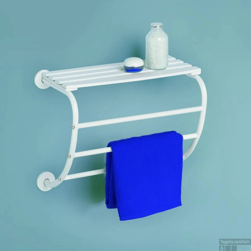 De CORFOU hangende handdoekhouder voor muurbevestiging van Allibert is de ideale oplossing voor het ophangen en drogen van uw handdoeken in de badkamer, vervaardigd uit hoogwaardige wit gelakt buizenframe met bovenaan een houten aflegplateau voor een stapel handdoeken. Geeft optimale en voldoende ruimte voor opberging van meerdere handdoeken in de badkamer.