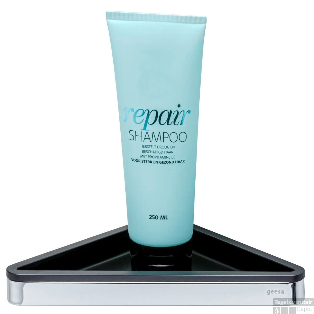 Met deze handige hoekplanchet heeft u altijd plek voor uw shampoo, douchegel en bodylotion in uw badkamer. Voorzien van een kunststof uitneembare inzet. De planchet is Zwart met chroom accent. Hij is van kunststof met messing.