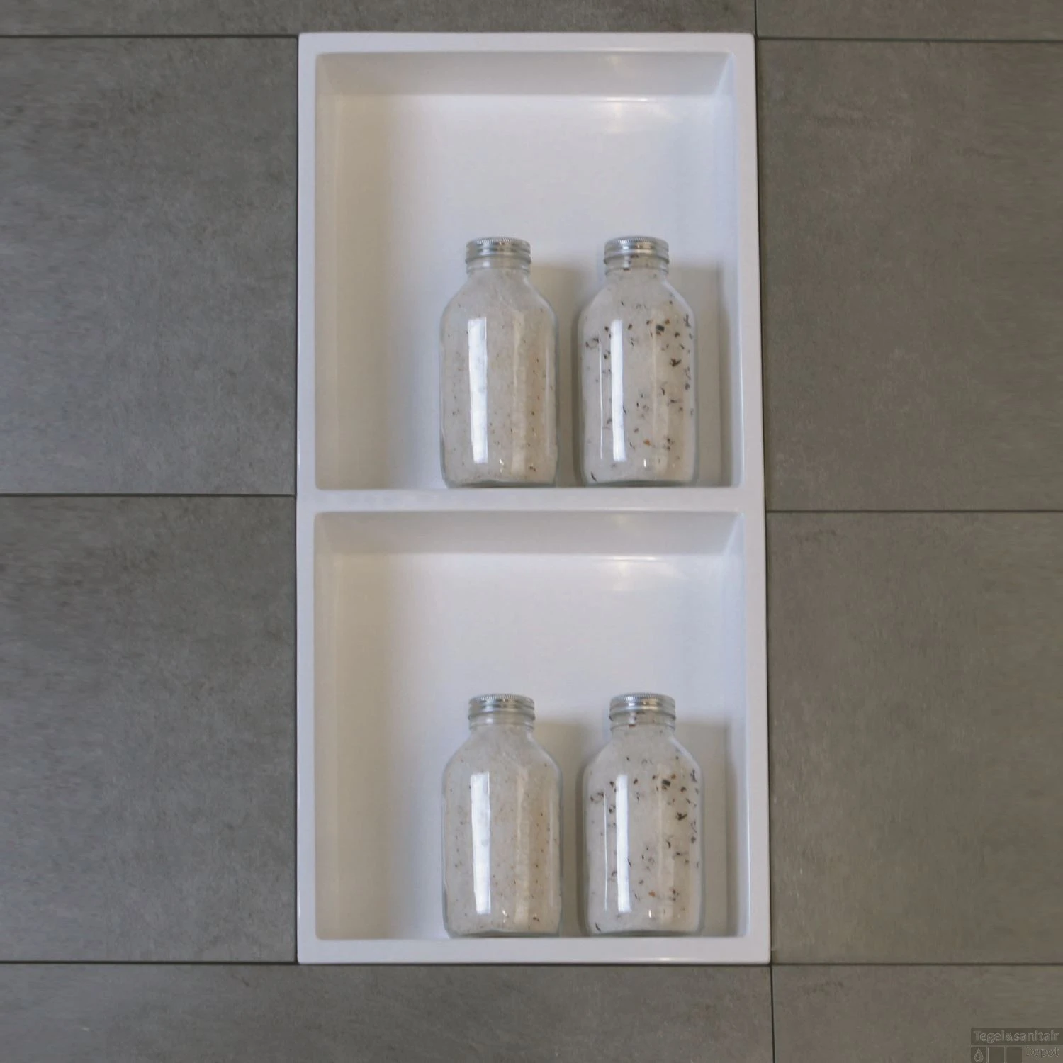 De oppervlakte van bijna 60x30cm is genoeg om er alle kanten mee op te kunnen gaan. Horizontaal of verticaal, dat maakt niets uit. Daarnaast is de nis voorzien van 2 vakken. Plaats hem in uw toiletruimte voor bijvoorbeeld toiletrollen of geurstokjes. Andere accessoires als fotolijstjes of kaarsjes kan natuurlijk ook. Omdat de nis is gemaakt van Solid Surface is de nis ook prima te monteren in de douchehoek voor al uw persoonlijk spullen.