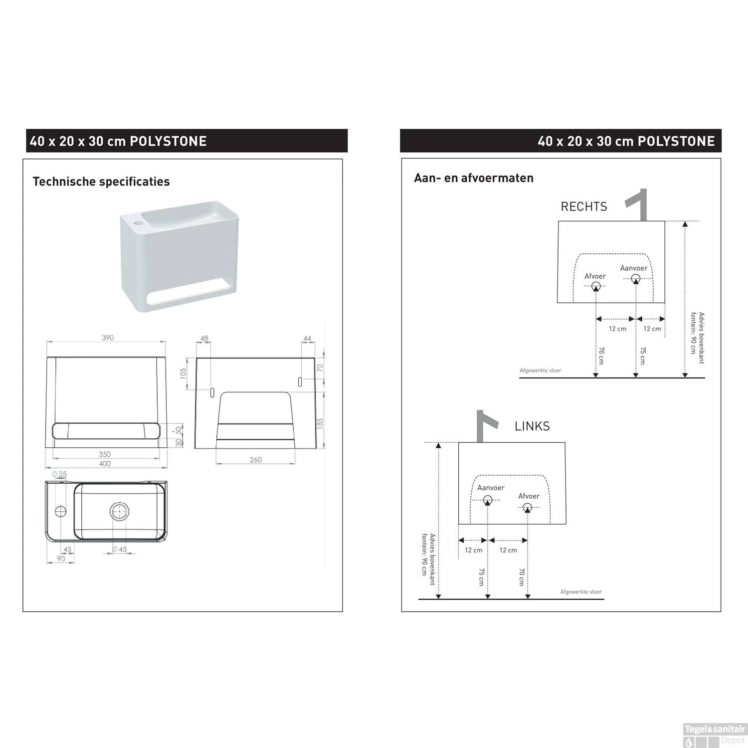 Specificaties INK Fontein Hangar Polystone Zonder Kraangat Links Glans Wit 40x22x30 cm