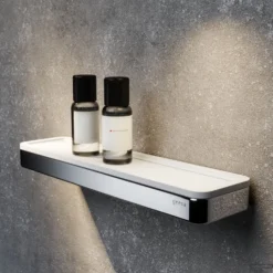 Met deze handige planchet heeft u altijd plek voor uw shampoo, douchegel en bodylotion in uw badkamer. Voorzien van een kunststof uitneembare inzet. De planchet is wit met chroom accent. Hij is van kunststof met messing.