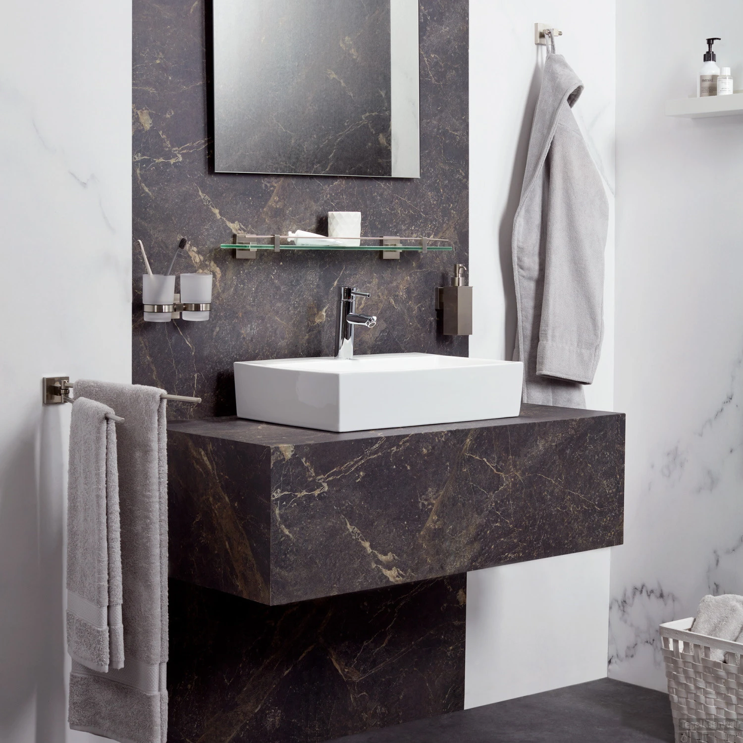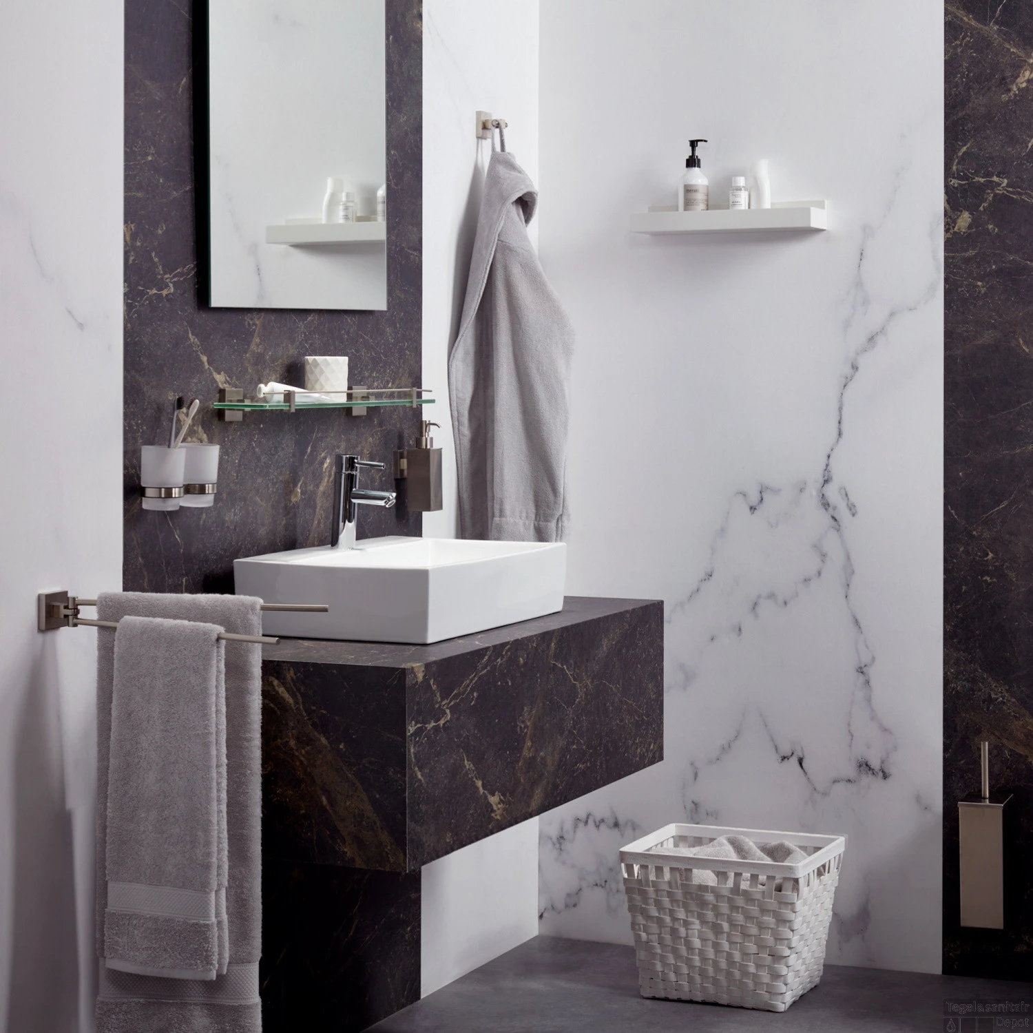 Zeer uitgebreide serie met kranen, accessoires, meubels en douchecabines. Modern design door de vierkante vormgeving. Voor de complete inrichting van de badkamer. Verkrijgbaar in chroom glanzend en matte RVS look (TEC).