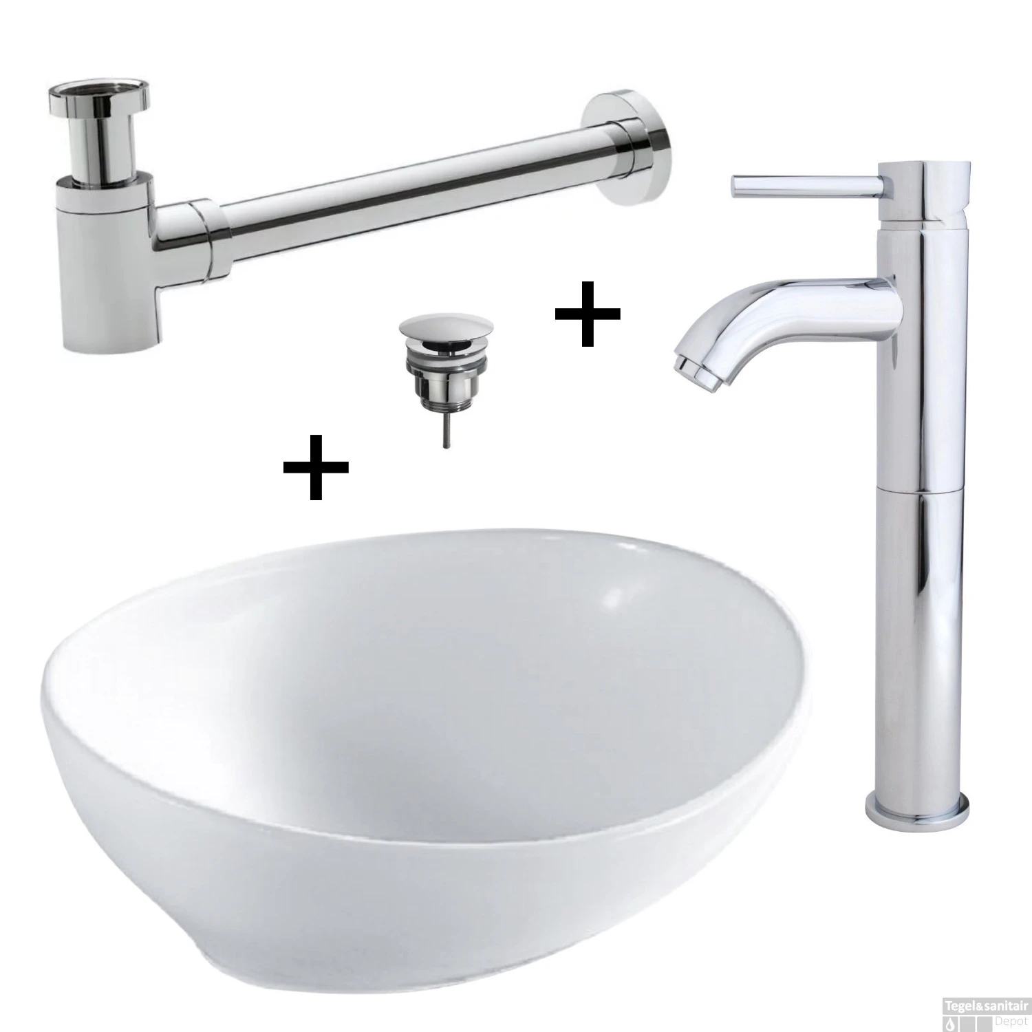 De waskom wordt geleverd als ONE-PACK wat u een mooi prijsvoordeel oplevert. Wat deze set zo uniek maakt is de combinatie van de waskom met een extra verhoogde wastafelkraan, sifon en een afsluitbare afvoerplug.