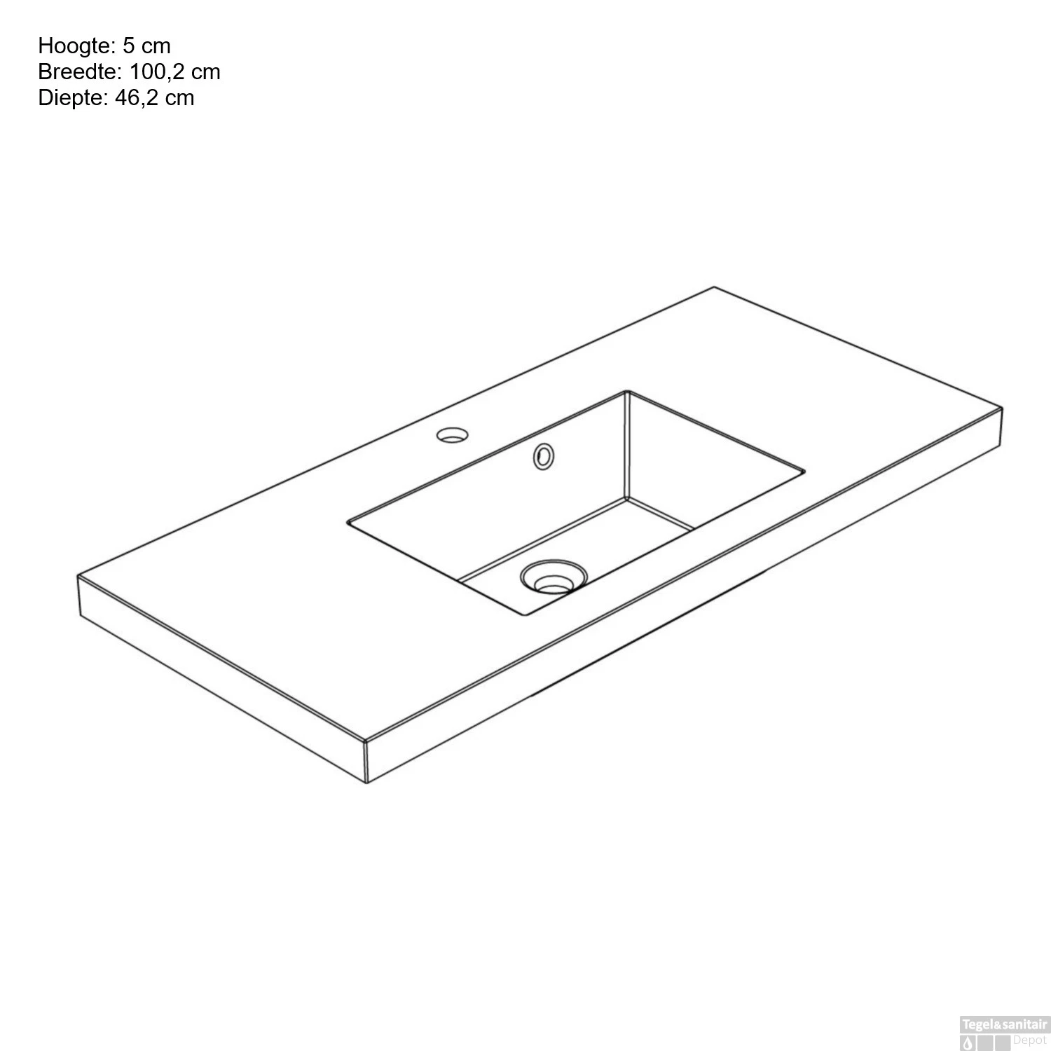 Deze wastafel is een enkele wasbak met de afmetingen 100,2 cm lang, 46,2 cm breed en 5 cm hoog. Het is een inbouw wastafel voor bovenop een onderkast.