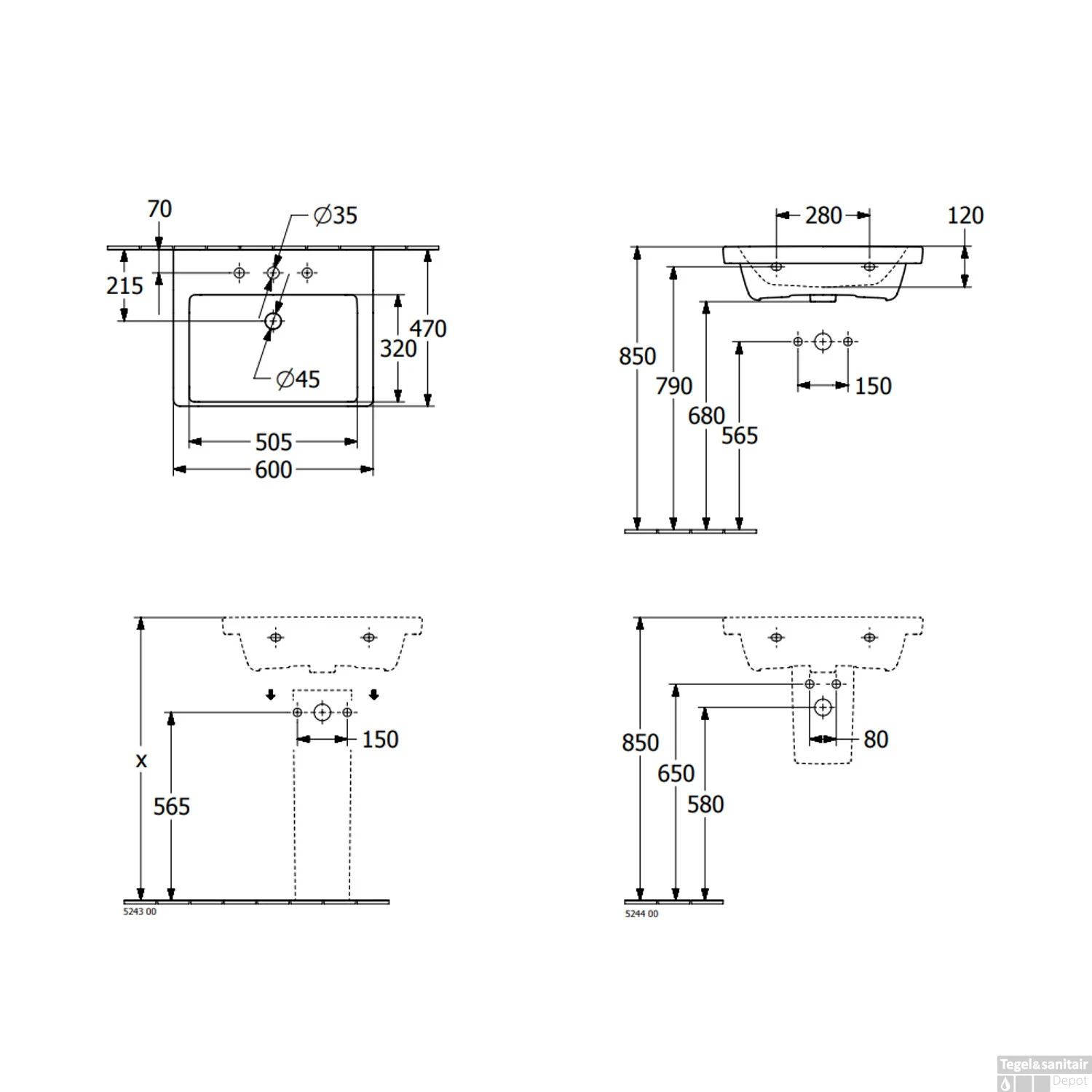 Specificaties Wastafel Villeroy & Boch Subway 3.0 Met CeramicPlus 1 Kraangat Met Overloop 60x47x16.5 cm Wit Alpin